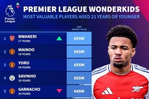 體育資訊3月19日訊 德國轉會市場更新了英超U21球員的最新身價,并列出身價榜單,恩瓦內里、梅努、約羅、薩維尼奧5500萬歐并列居首。