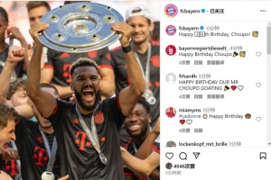體育資訊3月23日訊 今天是喀麥隆前鋒舒波莫廷的36歲生日,老東家拜仁為他送上祝福。