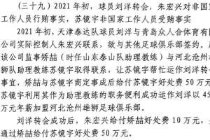 2021年初,球員劉洋轉(zhuǎn)會,朱宏興對非國家工作人員行賄事實,蘇鏡宇非國家工作人員受賄事實2021年初,天津泰達隊球員劉洋與青島眾人合體育有限公司實際控制人朱宏興聯(lián)系,欲與其他足球俱樂部簽約。后該公司監(jiān)事矯喆(時任山東泰山隊助理教練)與河北滄州雄獅隊助理教練蘇鏡宇取得聯(lián)系,讓蘇鏡宇幫忙運作劉洋轉(zhuǎn)會事宜,矯喆與蘇鏡宇商定事成后給付蘇鏡宇好處費50萬元。蘇鏡宇利用其作為助理教練的職務便利成功運作劉洋以450萬元年薪加盟河北滄州雄獅足球俱樂部。