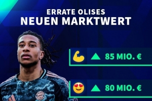 奧利塞目前的德轉身價為6500萬歐元,對于他接下來的最新身價,德轉給出了4個選項,由低到高為7000萬歐、7500萬歐、8000萬歐、8500萬歐。