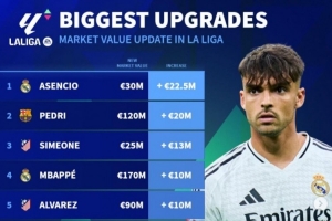 體育資訊3月24日訊 《轉(zhuǎn)會市場》統(tǒng)計了西甲球員身價更新后的升值最多情況,勞爾-阿森西奧力壓佩德里居首。