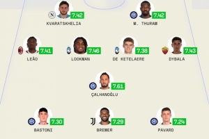 中場:萊奧(米蘭,7.41分)、盧克曼(亞特蘭大,7.46分)、恰爾汗奧盧(國米,7.61分)、德凱特拉雷(亞特蘭大,7.38分)、迪巴拉(羅馬,7.43分)