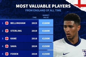 體育資訊3月25日訊 英格蘭將在本輪世預(yù)賽主場迎戰(zhàn)拉脫維亞,《轉(zhuǎn)會市場》也統(tǒng)計了英格蘭球員歷史身價前十均達到1億歐元大關(guān)。