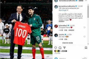 此役是B席為葡萄牙隊(duì)出戰(zhàn)的第100場(chǎng)比賽,因此獲贈(zèng)紀(jì)念球衣。他在社交媒體上曬出照片,并寫道:“為葡萄牙國(guó)家隊(duì)出戰(zhàn)100場(chǎng)比賽,我感到非常自豪和高興!我們進(jìn)入了四強(qiáng),感謝所有葡萄牙球迷在兩回合比賽中的支持?!?/p>