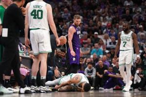 比賽第三節(jié)還剩3分35秒時,塔圖姆出手三分后被小薩墊腳,痛苦捂腳,但還是堅持執(zhí)行了罰球,隨后自行離場。