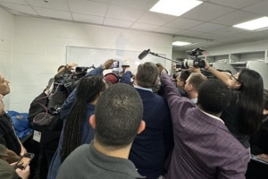 比賽結(jié)束后,巴特勒的采訪現(xiàn)場被媒體圍得水泄不通。