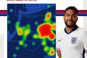 里斯-詹姆斯當(dāng)選本場(chǎng)比賽最佳球員,英格蘭隊(duì)社媒曬出他此役的熱點(diǎn)圖,并配上火焰的表情符號(hào),稱贊他的出色表現(xiàn)。