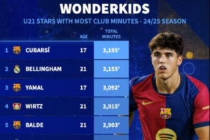 體育資訊3月26日訊 根據(jù)德轉(zhuǎn)統(tǒng)計(jì),庫(kù)巴西是本賽季出場(chǎng)時(shí)間最多的U21球員,達(dá)到3195分鐘,貝林厄姆、亞馬爾分居二三位。