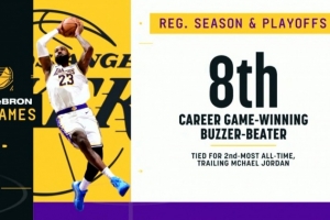 據(jù)統(tǒng)計,這是詹姆斯生涯(常規(guī)賽+季后賽)第8次完成壓哨絕殺,他追平了科比-布萊恩特和喬-約翰遜,并列歷史第二,僅次于邁克爾-喬丹的9次壓哨絕殺。
