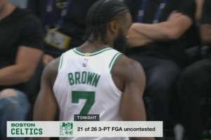 據(jù)統(tǒng)計(jì),凱爾特人本場前26次三分出手有21次是沒有干擾的。半場結(jié)束是,綠軍的三分球32投14中。