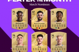 體育資訊3月27日訊 英超聯(lián)賽今天公布了3月份最佳球員候選名單,B費(fèi)、賴斯領(lǐng)銜。