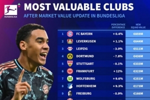 德甲球隊德轉(zhuǎn)身價排名(括號內(nèi)為更新后身價變化幅度):