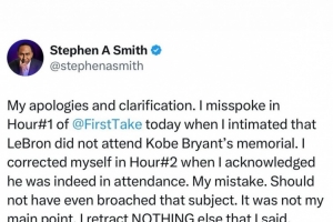 體育資訊3月28日訊 今日,ESPN著名主持人斯蒂芬-A-史密斯發(fā)推就他涉及詹姆斯的節(jié)目言論進行致歉。
