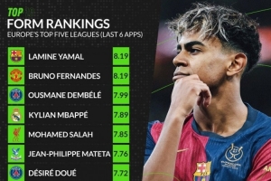 體育資訊3月28日訊 國家隊比賽周已經(jīng)結(jié)束,whoscored統(tǒng)計了五大聯(lián)賽此前6輪的場均評分情況,亞馬爾和B費并列居首。