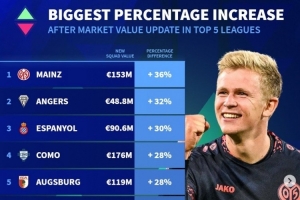 體育資訊3月28日訊 《轉(zhuǎn)會(huì)市場(chǎng)》已經(jīng)更新了五大聯(lián)賽球員身價(jià),也統(tǒng)計(jì)了本期更新各隊(duì)身價(jià)升值比例情況。