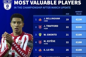 體育資訊3月28日訊 德國轉會市場今日曬海報,列出英冠球員身價排名,小貝林厄姆2200萬歐元居首。