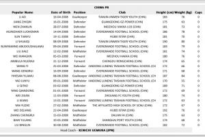 前鋒:7-布尼亞明-阿不都沙拉木(恒大足球?qū)W校)、9-魏祥鑫(梅州客家)、10-艾比布拉(成都蓉城)、16-楊黔東(恒大足球?qū)W校)、17-魏子?。ㄕ憬殬I(yè)足球俱樂部)、18-李翔(山東泰山)