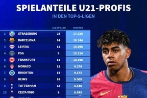 體育資訊3月29日訊 德國轉(zhuǎn)會市場統(tǒng)計了本賽季五大聯(lián)賽球隊U21球員的出場時間,并列出排名,斯特拉斯堡居首,巴薩、萊比錫排名二三位。