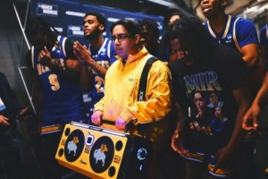 上月,麥克尼斯州立大學(xué)對(duì)陣德克薩斯大學(xué)里奧格蘭德河谷分校的比賽前,阿米爾·汗(Amir Khan)斜挎一個(gè)巨大的藍(lán)牙音箱,帶領(lǐng)麥克尼斯州立大學(xué)的隊(duì)員們?nèi)雸觯騿T們將矮了一頭的他圍在中間,一同放聲唱起了說唱歌手Lud Foe的歌曲《In & Out》。