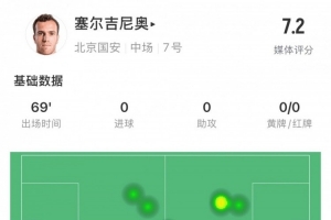 體育資訊3月29日訊 今晚進行的中超第三輪比賽,北京國安主場迎戰(zhàn)成都蓉城,首發(fā)登場的塞爾吉尼奧迎來國安生涯首秀。第70分鐘塞爾吉尼奧被隊友換下,此役他個人數(shù)據(jù)如下: