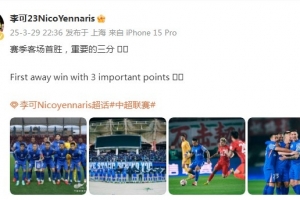 李可用中英文寫(xiě)道:“賽季客場(chǎng)首勝,重要的三分!”