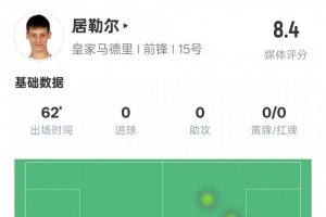 居勒爾本場比賽具體數(shù)據(jù)如下: