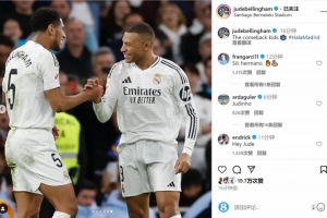 貝林厄姆社媒曬出與姆巴佩的合照,慶祝球隊取勝,配文:“逆轉(zhuǎn)兄弟團(tuán)!Hala Madrid!”