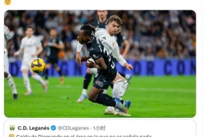 此役補時階段萊加內(nèi)斯球員迪奧曼德在皇馬禁區(qū)內(nèi)倒地,但裁判沒有判罰點球。