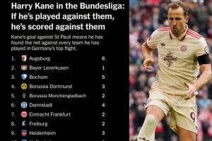 2023年夏天加入拜仁后,凱恩在德甲一共面對(duì)過19支球隊(duì),在昨天的比賽之前,只有圣保利還沒有被他進(jìn)過球,而現(xiàn)在對(duì)圣保利破門后,凱恩已經(jīng)對(duì)自己德甲生涯遇到過的所有對(duì)手都進(jìn)過球了。