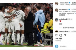 皇馬主帥安切洛蒂社媒曬出與球員們慶祝的照片,并配文:“一場奉獻(xiàn)和犧牲精神帶來的勝利,我們繼續(xù)前進(jìn)!”