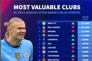 轉(zhuǎn)會市場列五大聯(lián)賽俱樂部最新身價榜:歐元