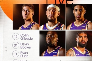 賽前太陽公布了本場首發(fā)陣容:吉萊斯皮、布克、瑞安-鄧恩、杜蘭特和理查茲。