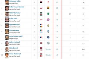 體育資訊03月31日訊 德國轉(zhuǎn)會市場統(tǒng)計數(shù)據(jù)顯示,最新的歐洲金靴排名情況,薩拉赫仍然領(lǐng)跑,但狀態(tài)火熱的萊萬已經(jīng)將差距縮小到2個球。