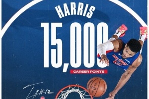 比賽進(jìn)行到第四節(jié),活塞球員托拜亞斯-哈里斯命中了本場第16分。而在本場之前,哈里斯的生涯總得分為14984分。