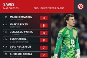體育資訊4月1日訊 Squawka統(tǒng)計(jì)了3月份英超門將的撲救次數(shù),并列出榜單,赫爾曼森9次居首,弗萊肯、維卡里奧、奧納納8次并列第二。