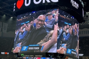 前NBA球員費(fèi)舍爾來到現(xiàn)場觀戰(zhàn),俄克拉荷馬球館內(nèi)掌聲雷動。