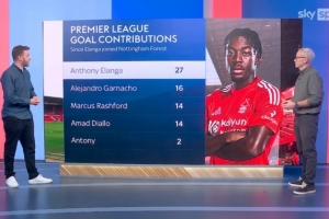 伊蘭加2023年夏天從曼聯(lián)轉(zhuǎn)會(huì)諾丁漢森林,轉(zhuǎn)會(huì)費(fèi)1750萬(wàn)歐元,天空體育指出,伊蘭加轉(zhuǎn)會(huì)以來(lái)在英超參與27粒進(jìn)球,同期加納喬參與16球,拉什福德、阿瑪?shù)?迪亞洛各參與14球,安東尼參與2球。