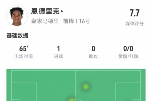 體育資訊4月2日訊 正在進(jìn)行的國(guó)王杯半決賽次回合,皇馬主場(chǎng)暫1-1皇家社會(huì),總比分2-1領(lǐng)先。此役恩德里克首發(fā)65分鐘被姆巴佩換下,球員全場(chǎng)重點(diǎn)數(shù)據(jù)如下↓
