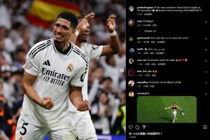貝林厄姆社媒曬出慶祝勝利的照片,配文:“伯納烏這樣的夜晚沒有更多言語形容,又一場決賽即將來臨!”