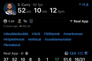 本場比賽,庫里出戰(zhàn)36分鐘,31投16中,三分20中12,罰球8中8,狂轟52分10板8助5斷1帽。