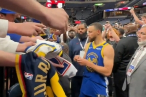 賽后,孟菲斯的球館化身庫(kù)里粉絲的海洋,庫(kù)里面對(duì)大量的球衣根本簽不過(guò)來(lái),最后只能簽一部分然后與球迷擊掌示意。