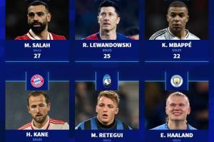體育資訊04月02日訊 歐洲五大聯(lián)賽激戰(zhàn)正酣,德轉(zhuǎn)統(tǒng)計了五大聯(lián)賽射手榜前六,薩拉赫27球居首,萊萬25球第2,姆巴佩、凱恩、雷特吉22球并列第3;哈蘭德21球排名第6,但因傷將缺席本賽季剩余大部分比賽。