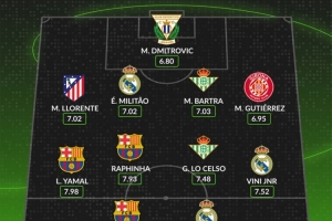 中場:亞馬爾(巴薩)7.98分、拉菲尼亞(巴薩)7.93分、洛塞爾索(貝蒂斯)7.48分、維尼修斯(皇馬)7.52分