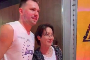 賽前湖人球星東契奇與防彈少年團(tuán)(BTS)成員J-Hope互動(dòng),為其送上球鞋并合影留念。