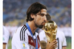 德國隊官方社媒曬出赫迪拉親吻大力神杯的照片,配文:“38歲生日快樂,赫迪拉!2014年世界杯冠軍!”