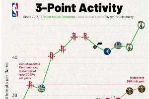 經(jīng)過(guò)短暫的停滯期后,聯(lián)盟對(duì)三分球的狂熱在本賽季再度飆升。如今每48分鐘的比賽平均出現(xiàn)75次三分出手,較上賽季的70次有所增加,這一增幅是歷史上最大的同比漲幅之一?,F(xiàn)代進(jìn)攻體系據(jù)此調(diào)整,球員們沿著三分線布設(shè)定點(diǎn)投籃點(diǎn)。在當(dāng)今的籃球場(chǎng)上,底角三分好比“陽(yáng)關(guān)大道”,而中距離跳投只是“獨(dú)木橋”。