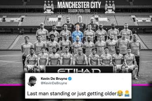 德布勞內曾在2022年曬出上圖調侃:最后站著的男人還是只是單純變老了?????♂?成老古董了。