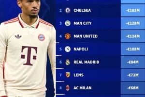 1、拜仁,-1.95億歐元