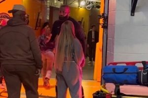 賽后,詹姆斯走回球員通道,詹嫂薩瓦娜等候多時,兩人進行了一波老夫老妻的有愛互動。