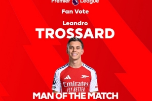 本場比賽特羅薩德首發(fā)出戰(zhàn),上半場打入一球。賽后他也以29.1%的得票率當(dāng)選英超官方球迷票選本場最佳球員。